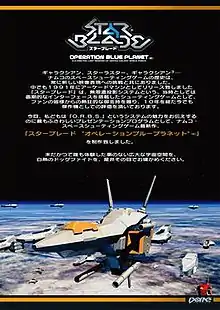 Starblade: Operation Blue Planet was directed by Higashiyama Asahi, and was created for a new arcade cabinet in production by Namco called the "Over Reality Booster System" (O.R.B.S.), a motion-based machine featured a retractable seat, air blowers, a 5.1 channel Dolby Digital audio system, and a large, globular projector screen.[2][3] The cabinet was originally designed in 1999, and was made to create a more immersive experience in arcade games.[4] Early versions of O.R.B.S. had a rotating screen that moved based on actions performed in the game, in a manner similar to Sega's R-360 motion-based cabinet from several years prior.[4] While the production team brainstormed ideas for which game to make first for the cabinet, designer Higashiyama Asahi suggested a sequel to Starblade, as he was a fan of the original and thought its first-person gameplay would work well[3] — the team thought the idea would be interesting, and began work on a new Starblade game for the O.R.B.S. cabinet.[3] Due to the shrinking arcade industry in Japan, gameplay was made to be simplistic and easy to understand for new players.[3]