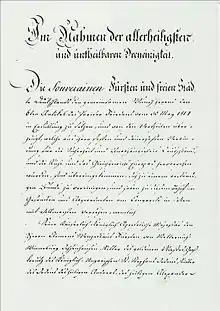 Formed in 1798 as the Tax Deputation (Steuerdeputation), the State Deputation of Hohenzollern-Hechingen initially exercised little control over the state of affairs in the principality. Constitutions were drafted in Hohenzollern-Hechingen and Hohenzollern-Sigmaringen in 1831 as a result of Article XIII of the 1815 Constitution of the German Confederation, which obligated member states to institute constitutions. In February 1835 new electoral regulations were adopted in the principality. These regulations formally changed the name of the Tax Deputation to the State Deputation and its powers were expanded significantly. The legislature consisted of 12 indirectly elected deputies (two of whom represented the city of Hechingen) representing eleven constituencies and met every three years.[1] Following the 1835 elections, the number of constituencies was reduced to six, with two deputies representing each constituency.[2]