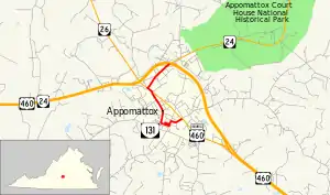 State Route 131 (SR 131) is a primary state highway in the U.S. state of Virginia. The state highway runs 1.65 miles (2.66 km) from U.S. Route 460 Business (US 460 Business) north to US 460 and SR 24 within Appomattox. SR 131 serves the Appomattox Historic District, which includes the downtown area of the town of Appomattox.