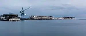 In the early part of the 20th century, the original pier was unable to accommodate the new breed of larger and more powerful steamships. As a result, the current pier was built between 1922 and 1930 and is the largest timber piled wharf structure in Australia. The Stothert and Pitt cranes were erected in 1949 for goods handling.[3] The original supports are still underneath the current pier, chopped down when the replacement was built. The new pier was designed so that passengers landed at the terminals above, while goods traffic moved underneath, in what was quite forward thinking for the 1920s.[4] It has a wharf length of 933 metres, and is capable of berthing ships 305 metres long with a draught of 10.3 metres.[1]