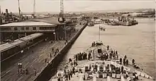 In January 1921 electric passenger services were extended to the platform at the Bay Excursion Pier, two years after electric trains had been extended to Port Melbourne. It was served by two trains per hour Monday to Friday, until their withdrawal in November 1930 as they were not financially rewarding to the Victorian Railways.[8] From 22 May 1933 passenger services were again extended to Station Pier, but only as required when overseas liners were berthed. The overhead wiring had to be extended beyond the Bay Excursion Platform onto the pier itself. The Boat Train service was introduced on 7 March 1936 with a single Tait train set painted in blue livery with silver roof. The name was added to the top of each motor car in red letters along with exterior lighting. Operating direct from Flinders Street station to Station Pier, the service was discontinued in October 1939.[8]