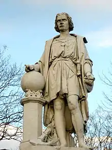 An 1876 statue of Christopher Columbus by Emanuele Caroni is installed in Marconi Plaza, 2848 South Broad Street, Philadelphia, Pennsylvania (United States), inside a railing that bears wire art of Columbus's three ships, the Niña, Pinta, and Santa Maria.