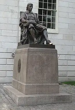 John Harvard is a sculpture in bronze by Daniel Chester French in Harvard Yard, Cambridge, Massachusetts, honoring clergyman John Harvard (1607–1638), whose deathbed[2] bequest to the "schoale or Colledge" recently undertaken by the Massachusetts Bay Colony was so gratefully received that it was consequently ordered "that the Colledge agreed upon formerly to bee built at Cambridg shalbee called Harvard Colledge." [3] There being nothing to indicate what John Harvard had looked like, French used a Harvard student collaterally descended from an early Harvard president as inspiration.