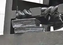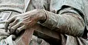 - 1 2 "The John Harvard Statue" (PDF). The New York Times. October 18, 1884. In quoting this passage the word book has been substituted for Bible per the unanimity of other sources,[M][5]: 279 [6][7]: 522 [8][9] all of which refer to the volume held by the figure as a book or tome, but not specifically a Bible. In the planning of the costume, "It was understood that Harvard was a clergyman educated at Cambridge, and, following as he did the fortunes of other clergymen who came to Massachusetts in the early period, he would be likely to be a Puritan of their stamp,—that is to say, not a Separatist. Pictures represent the Puritan minister of that day as wearing a somewhat closely fitting cloak, covering perhaps a cassock, with a broad linen collar and a skull-cap. The narrow bands and the wig came in later. No mistake could be made in the garment worn over the lower part of the body." [10] That John Harvard is wearing a skullcap is frequently overlooked. "Edward T. Wilcox, A.M. '49 ... had a 38-year tenure at the College, during which he no doubt won many a highball with the following challenge [which he repeated during remarks at a 1974 ceremony honoring long-serving University employees]. 'How many of you would be prepared to bet one way or the other ... if I told you John Harvard is actually wearing a cap?'" [11] Other subtle details are a slight mustache, tassels at the collar, and "roselike decorations" on the shoes.[9]
