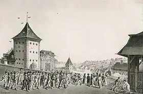 The war began with an engagement at Rengg Pass on 28 August, where government troops were defeated by federalists from Nidwalden, followed by unsuccessful artillery attacks on Zürich from 10 to 13 September by government forces.[1] The rebels soon captured Bern, which was also briefly shelled.[1] The Helvetic government, headed by Landamman Johann Rudolf Dolder, capitulated militarily on September 18, but was able to negotiate a retreat from Bern to Lausanne before collapsing entirely.[1][3]