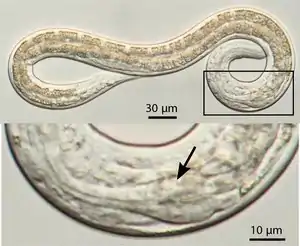 Steinernema carpocapsae is categorized as an entomopathogenic nematode, which is a specialized subgroup of insect-parasitic nematodes.[3][4] The infective juvenile stage (IJ) is a modified third stage larva and is the only free-living stage of this nematode. It is a developmentally arrested, non-feeding stage, that seeks out an insect host to infect. All other life stages (L1, L2, L3, L4, and adult) occur within an insect host. The IJ enters the host through natural openings such as the spiracles, mouth, anus, or in some species through intersegmental membranes of the cuticle, and then enters into the hemocoel.[3] S. carpocapsae are mutualistically associated with the bacterium Xenorhabdus nematophila.[5] When the IJ stage enters the host, it initiates the actively parasitic part of its lifecycle. This process includes the resumption of development, and the release of their symbiotic bacteria and a variety of nematode-derived proteins into the hemocoel.[6] Though the X. nematophila bacteria is carried by the IJ in a specialized structure in the anterior gut called the receptacle, it is released into the host through defecation.[7][8] The bacteria multiply in the insect hemolymph and the infected host usually dies within 24 to 48 hours. After the death of the host, nematodes continue to feed on the host tissue and the multiplying bacteria. They develop into males and females and reproduce. The progeny develop through four juvenile stages to the adult. Depending on the available resources, one or more generations may occur within the host cadaver and a large number of infective juveniles is eventually released into the environment to infect other hosts and continue their lifecycle.[3][5]