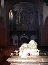 The basilica contains the tomb of Hermann Joseph of Steinfeld, a popular Premonstratensian saint, situated in the middle of the church and covered with a slab and a recumbent figure of alabaster, carved in 1732. This has become a pilgrimage destination. By custom apples are left here, in reference to a legend that Hermann once offered an apple to the Christ Child in the arms of the Madonna in the church of St. Maria im Kapitol at Cologne - who took it.