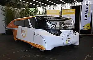 Stella and its successors Stella Lux, Stella Vie and Stella Era are a series of solar racing family cars, built for the World Solar Challenge in Australia, sofar winning its Cruiser Class all four times it was held – in 2013, 2015, 2017 and in 2019.[1][2][3][4] Stella is considered the world’s first solar-powered family car and was given the 'Best Technology Development' Award at the 8th annual Crunchies in San Francisco in 2015.[5][6] Being the only competing vehicle with a license plate, the road registration of Stella contributed to the winning score in the races.[7] The vehicles are designed and built by "Solar Team Eindhoven" (STE) — some 26 students of different faculties of the Eindhoven University of Technology (TU/e) in the Netherlands. The group have set up a non-profit foundation to promote their concepts for practical solar vehicles for adoption on a broader scale.[8]