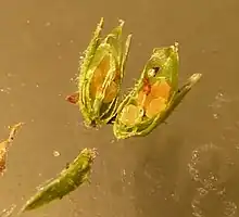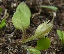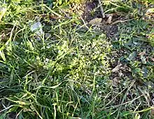 Flowering occurs in the early spring, February-May in Northern Europe.[3] The inflorescences are terminal and consist of a short cyme of up to six flowers, which are small, 2–3 mm in diameter. There are four or five hairy oval/lanceolate green sepals 2–3.5 mm long. Most flowers have no petals at all, but a small proportion have five deeply bifid green/scarious petals about 1 mm longer than the sepals, which never open widely. There are usually between one and three stamens, sometimes none, with grey-violet anthers, and three styles.[2][4]