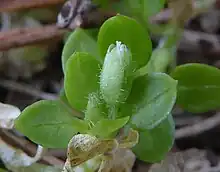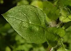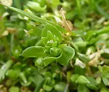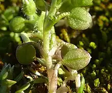 Lesser chickweed is a low-growing, patch-forming annual herb with a distinctly yellowish-green colour. It has a dense, spreading root mat which makes it difficult to dislodge from the ground. The stems, which are sometimes tinged purple, spread out along the ground without rooting at the nodes, and lengthen to about 10 cm long. They are terete and glabrous, with a single line of hairs down one side, which alternates at the nodes. The leaves are opposite, pale green and ovate, 4-7 mm long by 2-3 mm wide, with a pale green or sometimes purple hydathode at the pointed tip and stomata on both sides. The petioles are flattened, hairy and about 3-5 mm long, except at the tip of the stem, where the leaves appear sessile.[1][2]