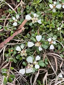 Stenanthemum pimeleoides, commonly known as spreading stenanthemum[2] or propellor plant,[3] is a species of flowering plant in the family Rhamnaceae and is endemic to Tasmania. It is a small, prostrate, mat-forming shrub with hairy young stems, egg-shaped leaves with the narrower end towards the base, and densely hairy clusters of tube-shaped flowers surrounded by conspicuous, whitish floral leaves.