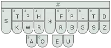 Stenotype keys normally are made of a hard, high-luster acrylic material with no markings. The keyboard layout of the American stenotype machine is shown at the top / right.