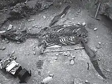 The remains were found articulated mostly in the Segment C of the Arcillolitas Abigarradas Member of the Paja Formation, with kaolinitic argillite corresponding to an intertidal marine environment, with several specimens of ammonites or impressions of these in the rock matrix, including one inside the skull. These ammonites include the species Gerhardtia galeatoides, G. provincialis and the genus Heinzia, typical of the Barremian. German paleontologist Oliver Hampe made an initial description of the specimen in 2005, classifying it as Brachauchenius sp., i.e. as an indeterminate species of this genus, previously only recorded in Upper Cretaceous sediments of the United States, and it constitutes the first reappearance of non-rhomaleosaurid pliosaurs after a hiatus between the Berriasian and Hauterivian.[3] In 2016, María Páramo, Marcela Gómez-Pérez, Fernando Etayo and Leslie Noé made a more complete description and they designated to VL17052004-1 as holotype of a new genus and species, Stenorhynchosaurus munozi.[1]