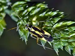Stenotus binotatus is a fairly large plant bug (6–7 millimetres or 0.24–0.28 inches long), which is somewhat variable in appearance.[2] The insect's sides are roughly parallel, and the colours depend on both the animal's sex and its age, the markings becoming darker and stronger with increasing age. Males are mostly yellow, with darker markings on the pronotum and forewings, which females are greenish-yellow with paler markings.[2]