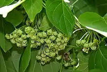 - Leaves: 3–6 inches long by 2–4 inches broad, rather coriaceous, base rounded or cordate ; nerves 4–6 pairs ; petiole 1–3 inches.