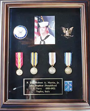 Donaldson had a longstanding desire to join the Navy, even buying a sailor's uniform during college, in which he cruised the city and pretended to be a serviceman on a visit to a naval base in Pensacola, Florida,[5] and maintained a "lifelong identification with sailors and seafaring."[7] After graduating from Columbia in 1970, he enlisted and served as a radioman at a NATO base in Italy with an unblemished record[4] until "he wrote to a former shipmate, Terry Fountain, about his latest sexual adventures [with both women and men] at his current home port of Naples, Italy".[17] After Fountain left the letter unattended on his desk, someone turned it over to the Naval Investigative Service, which allegedly coerced Fountain into signing a statement that he had sex with Donaldson, which Fountain later recanted. In 1971, "the Navy announced its intention to release [Donaldson] by General Discharge on grounds of suspected homosexual involvement."[4] As Randy Shilts wrote in Conduct Unbecoming: Gays and Lesbians in the US Military: