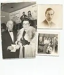 Stephen G. Watts with his first wife Margaret Furse at the Royal Film Premier of Anne of the Thousand Days (1969), for which Furse won the Academy Award for Best Costume Design, on 23 February 1970. The smaller pictures are of Watts as a younger man and with his sister Williamina ("Ina") Bottomley (nee Watts) (back left) in about 1940.