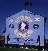 McKeag was buried at Roselawn Cemetery in the east of the city in front of around 1,000 mourners, including Adair, Smyth and UVF/RHC representatives, with floral tributes sent by Ulster Young Militants and Combat 18.[35] Although by this time he was estranged from the leadership of C Company, McKeag's litany of violence meant he retained his hero status with the younger members of the group and as a result a new mural was painted on the lower Shankill in commemoration of McKeag.[37] It has been updated several times.[38]