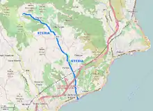 The creek is formed at Monte Lago (Ligurian Prealps, 774 m) in comune of Villa Faraldi, and flows at first heading South-East; near Riva Faraldi it turns South and receives from the left hand Fontana and Paniga creeks.[3] After leaving Villa Faraldi it enters San Bartolomeo al Mare municipality; between Molino del Fico and borgata Freschi gets the waters of its main tributary, torrente di Tovo. The Steria marks then the border between the municipalities of San Bartolomeo al Mare (West) and Cervo following southwards and, after being crossed by Genoa–Ventimiglia railway, Autostrada A10 and Aurelia national road, ends its course in the Ligurian Sea.