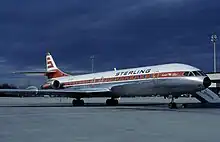 Historically Sterling Airways operated several Sud Aviation Caravelle IIIs and seven Super-Caravelles. During the time between late 1970s and the 1993 bankruptcy, Sterling also operated three Boeing 727s, two Douglas DC-8-63s (stretched "Super DC 8") and one Super DC-8-62CF as well as an Aerospatiale Corvette.