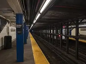 The underground station has two tracks and two side platforms.[8] The station is served by the 2 train at all times[9] and by the 5 train on weekdays during the day.[10] It is between Winthrop Street to the south and President Street–Medgar Evers College to the north.[11] The platforms have original 1920s Dual Contracts era tiling. The name tablets have "STERLING ST." in white letters on a brown background with a blue and brown border. The tile's trim line consists of light brown coloring with a border composed of a mix of dark blue and brown coloring. An intermediate line of green runs between these two borders.