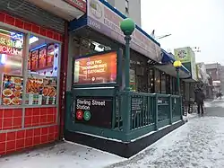 The Sterling Street station is a station on the IRT Nostrand Avenue Line of the New York City Subway. Located in Prospect Lefferts Gardens, Brooklyn at the intersection of Sterling Street and Nostrand Avenue, the station is served by the 2 train at all times and the 5 train on weekdays.