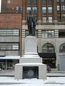 Mason was initially interred at New York Marble Cemetery,[9] but on June 4, 1905, his remains were brought from New York to Detroit, accompanied by his sister Emily Mason, then age 92; his daughter, Dorothy Mason Wright; three grandsons; and several grand-nephews and great-grandchildren. Services were conducted by Rev. David M. Cooper, who had known Mason as governor, 70 years earlier. Other notable attendees included then-Governor Fred M. Warner, and the mayor of Detroit, George P. Codd. His remains were interred at Capitol Park, the site of the old Michigan Capitol.[10] Later, a bronze statue of Mason on a granite pedestal was erected over the grave. The statue was created by sculptor Albert Weinert and depicted the young Mason in a confident pose.[11]