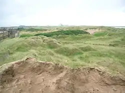 The sand dunes lay in the lands of Saltcoats Campbell, belonging to the Campbell's of Dovecothall and later to the Warner's of Ardeer House near Piperheugh on the outskirts of Stevenston.[5] The early OS maps show that a magnesia works was present in the area from 1832. A dwelling known as Summerseat in 1856 extended into the northern part of the dunes, bisected by the railway that forms the present boundary. Railway tracks and tramways associated with the Auchenharvie Colliery pit and its bing or spoil heap extended into the dune slack area until lifted in the 1940s. A Trig Point was positioned on top of this bing. The promenade or sea defence for the railway forms the western boundary of the LNR and the Stevenston Burn forms the eastern boundary. In the 1970s a couple of small buildings were all that was left of the old colliery and satellite photographs show their foundations and the extent of the spoil heap.