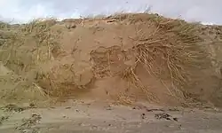 Rarer sand dune vegetation such as Babington's Orache (Atriplex glabriuscula) and Isle of Man cabbage (Coincya monensis monensis) have been recorded,[1] together with typical sand dune wild flowers, including European marram grass (Ammophila arenaria), lyme grass (Leymus arenarius), kidney vetch, tufted vetch, common restharrow (Ononis repens), European searocket (Cakile maritima), sea campion (Silene maritima), prickly saltwort (Kali turgida), Scottish bluebell (Campanula rotundifolia), bird's-foot trefoil, ragwort (Senecio jacobaea), sea mayweed (Tripleurospermum maritimum) and sea sandwort (Honckenya peploides). Plants such as lyme grass were so important in stabilising sand dunes that during the 17th-century reign of William III, the Scottish Parliament passed a law protecting it.[7]