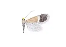 The wingspan is 5–6 millimetres (0.20–0.24 in). The head is ferruginous-yellowish with a paler collar. Antennal eyecaps are yellow-whitish. Forewings dark fuscous, mixed, or almost wholly suffused with pale ochreous-yellowish ; a pale ochreous-yellowish oblique fascia beyond middle; apical area beyond this dark fuscous, faintly purplish tinged; apical cilia ochreous-white except at base. Hindwings light grey.[2]