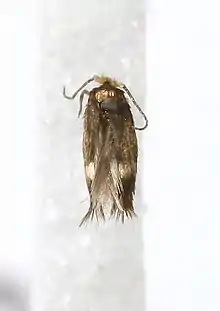 The wingspan is 3–4 millimetres (0.12–0.16 in).The head is ochreous-yellowish, collar ochreous-whitish. Antennal eyecaps ochreous-whitish. Forewings purplish-fuscous ; a rather oblique shining whitish fascia beyond middle ; apical area beyond this darker and more purple. Hindwings grey.[2] Adults are on wing in May and again in August.[3] The moths are parthenogenetic.[4]