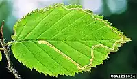 Yellow with a bright green gut; the head is light brown. They feed venter (belly) upwards. The mines are narrow and often angular and the linear frass fills less than half of the mine. The mine widens gradually but is never wider than the width of the larva. In the later stages the frass is dispersed and irregular, filling about two-thirds of the mine. Sometimes there can be several larvae mining the same leaf.[5][6]