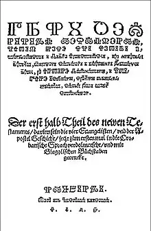 Language used by Dalmatin and Istranin was based on northern-Chakavian dialect with elements of Shtokavian and Ikavian.[12] People from the institute, including Trubar, were not satisfied with translations of Dalmatin and Istranin.[12] For long time they tried to engage certain Dimitrije Serb to help them, but without success.[13] Eventually, they managed to engage two Serbian Orthodox priests, Jovan Maleševac from Ottoman Bosnia and Matija Popović from Ottoman Serbia.[13]