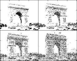 The image to the left shows an original picture of the Arc de Triomphe in Paris. If this image is passed through a nonlinear threshold filter in which each pixel detects light intensity as above or below a given threshold, a representation of the image is obtained as in the images to the right. It can be hard to discern the objects in the filtered image in the top left because of the reduced amount of information present. The addition of noise before the threshold operation can result in a more recognizable output. The image below shows four versions of the image after the threshold operation with different levels of noise variance; the image in the top right hand corner appears to have the optimal level of noise allowing the Arc to be recognized, but other noise variances reveal different features.