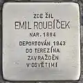 HERE LIVED EMIL ROUBÍČEK BORN 1894 DEPORTED 1943 TO THERESIENSTADT MURDERED IN AUSCHWITZ |