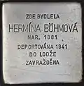 HERE LIVED HERMÍNA BÖHMOVÁ BORN 1881 DEPORTED 1941 TO ŁÓDŹ MURDERED |