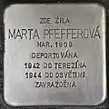 HERE LIVED MARTA PFEFFEROVÁ BORN 1909 DEPORTED 1942 TO THERESIENSTADT 1944 TO AUSCHWITZ MURDERED |