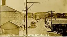 A ferry between Portsmouth and Tiverton – probably the first regular ferry in Rhode Island – began operating in 1640. It was variously known as Howland's Ferry (after the family that ran it from around 1703 to 1776), Pocasset Ferry, Sanford's Ferry and Wanton's Ferry.[1] A privately-owned wooden toll bridge was built in 1795. After it was destroyed several times by storms, a stone causeway with a wooden draw span was built in 1810. The towns of Tiverton and Portsmouth purchased the bridge in 1871 and conveyed it to the state.[2]