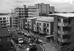 Although other high-quality housing had grown up around the now-closed nearby Harlesden (Midland) railway station, the area failed to consolidate as an up-market suburb, because of the general expansion of London, increasing industry, and the building of low-quality, cheap housing, in the late nineteenth century. Sub-division of many of the large houses was carried out and Stonebridge became a low-income area, which continued after high-rise comprehensive redevelopment, mostly built in a single architectural style and called the 'Stonebridge Estate', in the 1960s and 1970s.[3][4]
