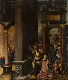 The painting had been badly damaged by the fire that broke out on 13 August 1947 in the Palais Rohan, reducing some works to ashes and disfiguring others through the intense heat and smoke. It was finally restored starting in 2021, and presented again to the public 75 years after its near-destruction. The painting is notable for its origin, having been commissioned by the cardinal Albert of Brandenburg, and for the presence of a self-portrait of the artist, sporting a moustache[3][4]