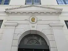 The building is constructed with three storeys over a walk-out basement. It has a seven-bays-long facade towards Store Kannikestræde, a four-bays-long facade towards Lille Kannikestræde and a chamfered corner. The plastered, white-painted facade features a belt course above the ground floor, wide corner lesenes and a modillioned cornice. It is finished with shadow joints on the ground floor and on the lesenes in the full height of the building. The arched main entrance in Store Kannikestræde is accented with a Neoclassical portal, with pilasters and a dentillated triangular pediment. The architrave features a gilded relief portrait of Peter Faber en profile, flanked by his first and last name in gilded lettering. The pitched, red tile roof features a number of dormer windows towards both streets. The roof ridge is pierced by three chimneys, one of them at the fire wall towards Store Kannikestræde 13.[3]