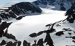Storglaciären (Swedish for The Great Glacier) is a glacier in Tarfala Valley in the Scandinavian Alps of Kiruna Municipality, Sweden. The glacier is classified as polythermal having both cold and warm bottom temperatures. It was on Storglaciären that the first glacier mass balance research program began (immediately after World War II), which continues to the present day; this is the longest continuous study of its type in the world. Storglaciären has had a cumulative negative mass balance of -17 m between 1946 and 2006. The program began monitoring the Rabots Glaciär in 1982, Riukojietna in 1985, and Mårmaglaciären in 1988. All three of these glaciers have had a strong negative mass balance since monitoring began.[2]