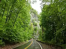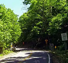 When it was opened in 1922 it shortened the distance required to travel by automobile from Newburgh to West Point, which are 10 miles (16 km) apart as the crow flies, by 22 miles (34 km).[1] In 1940 this distance was further cut by the four-lane U.S. Route 9W, which travels west of Storm King.[9] It remains a well-used commuter route for employees of the United States Military Academy who live in Cornwall.[10] They must use alternate routes when the gates are closed,[2][11] as they were for over a year following 1999 forest fires on Storm King and its vicinity.[10]