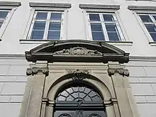 Stormgade 6 is constructed in brick with four storeys above a walk-out basement. The seven-bays-wide facade is plastered and grey-painted. The ground floor is finished with shadow jouints and painted in a slightly darker grey colour than the three upper floors. The portal that adorm the main entrrance in the central bay dates from 1755 and was reused from the previous building on the site.[8] The main entrance is flanked by basement entrances in the two outer bays. The facade is finished by a dentillated cornice. The first-floor windows are topped by hood moulds and the third-floor windows are accented with sills. The roof features seven dormer windows. The building was listed in the Danish registry of protected buildings and places in 1918.[1]