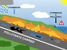 Daily human activities result in deposition of pollutants on roads, lawns, roofs, farm fields, and other land surfaces. Such pollutants include trash, sediment, nutrients, bacteria, pesticides, metals, and petroleum byproducts.[4] When it rains or there is irrigation, water runs off and ultimately makes its way to a river, lake, or the ocean. While there is some attenuation of these pollutants before entering receiving waters, polluted runoff results in large enough quantities of pollutants to impair receiving waters.[5]