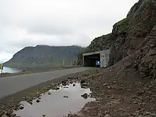 Strákagöng (Icelandic pronunciation: [ˈstrauːkaˌkœyŋk] ⓘ) is a tunnel in Iceland, located in Northwestern Region along Route 76. It has a length of 800 m (2,625 ft) and was opened in 1967.[1] It is the second tunnel ever built in Iceland, only preceded by a minor tunnel of 30 meters between Ísafjörður and Súðavík. Prior to the tunnel being built, the only road connection to the town of Siglufjörður was a very difficult mountain road built in 1946, that was closed about 5 months a year due to snow.