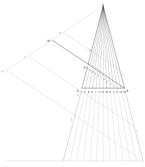 Stråhle instructed first to draw a line segment QR of a convenient length divided in twelve equal parts, with points labeled I through XIII. QR is then used as the base of an isosceles triangle with sides OQ and OR twice as long as QR, and rays drawn from vertex O through each of the numbered points on the base. Finally a line is drawn from vertex R at an angle through a point P on the opposite leg of the triangle seven units from Q to a point M, located at twice the distance from R as P. The length of MR gives the length of the lowest sounding pitch, and the length of MP the highest of the string lengths generated by the construction, and the sounding lengths between them are determined by the distances from M to the intersections of MR with lines O I through O XII, at points labeled 1 through 12.
