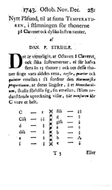 Stråhle published his construction as a "new invention, to determine the Temperament in tuning, for the pitches of the clavichord and similar instruments" in an article that appeared in the fourth volume of the proceedings of the newly formed Royal Swedish Academy of Sciences, which included articles by prominent scholars and Academy members Polhem, Carl Linnaeus, Carl Fredrik Mennander, Augustin Ehrensvärd, and Samuel Klingenstierna. According to organologist Eva Helenius musical tuning was a subject of intense debate in the Academy during the 1740s,[8] and though Stråhle himself was not a member his was the third article on practical musical topics published by the Academy—the first two were by amateur musical instrument maker, minister, and Academy member Nils Brelin[9] which related inventions applicable to harpsichords and clavichords.[10]
