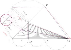 Kützing instructed to extend a line segment bc—representing a known sounding length—at 45 degrees to the line ba, and from its octave at point d located midway between b and c, to extend a line perpendicular to ba intersecting it at e, then to divide de into 12 equal parts. The point a on ab is located by transferring the lengths of de, db, from e away from b, and rays extended from a through the points dividing de and intersecting bc to locate the different endpoints of the string lengths from c.[25]