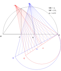 He instructed to first draw the line MR corresponding to the larger of the two numbers with MP the smaller, and to construct their mean proportional at MB. The line that will carry the divisions is drawn from R at any acute angle to MR, and perpendicular to it a line is drawn through B, which intersects the line to be divided at A, and RA is extended to Q such that RA=AQ. A line is drawn from Q through P, intersecting the line through BA at O, and a line drawn from O to R. The construction is completed by dividing QR and drawing rays from O through each of the divisions.